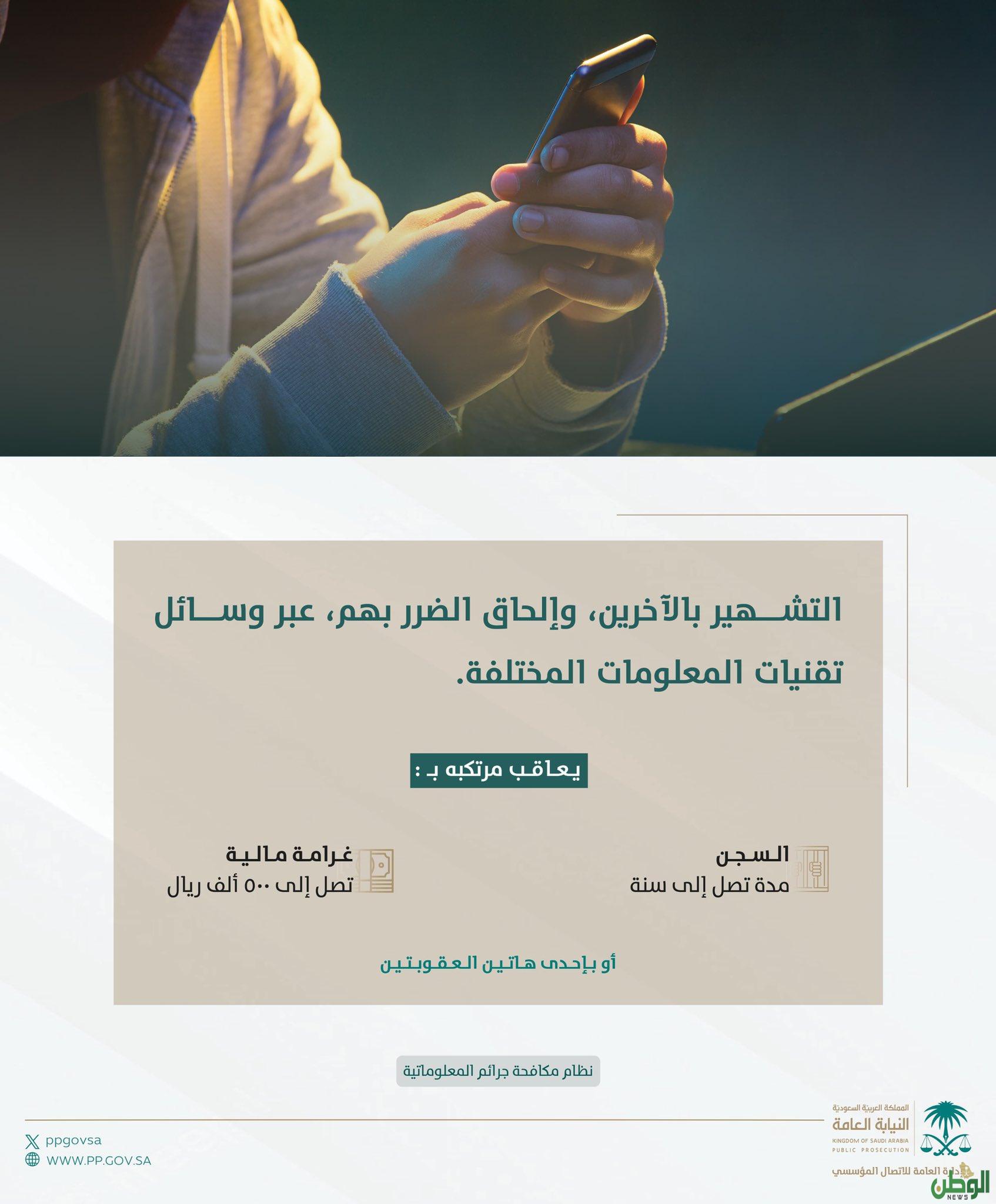 وأوضحت النيابة العامة ، أن عقوبة التشهير بالآخرين وإلحاق الضرر بهم تشمل السجن سنة وغرامة مالية تصل إلى 500 ألف ريال ، أو بإحدى هاتين العقوبتين .