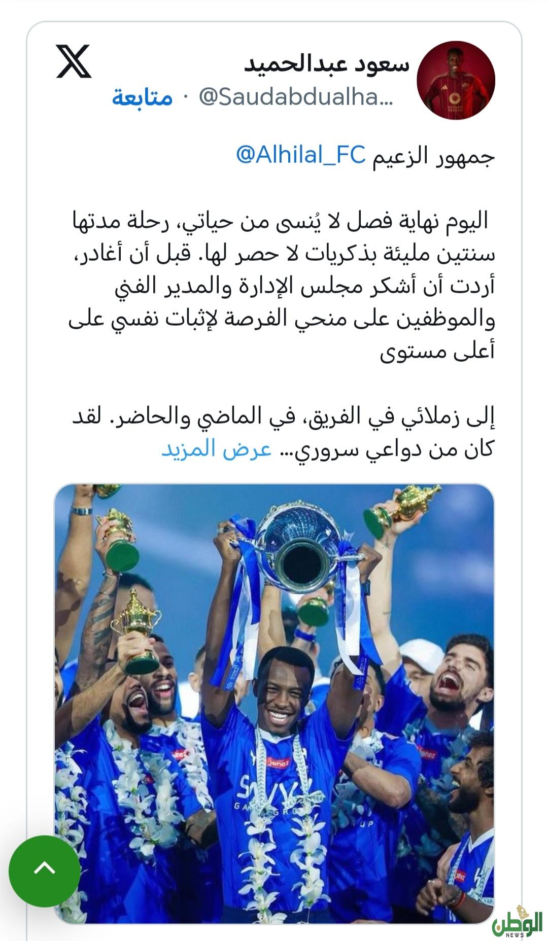 وكتب سعود عبدالحميد عبر حسابه الشخصي على موقع التواصل الاجتماعي «إكس»: «اليوم نهاية فصل لا يُنسى من حياتي، رحلة مدتها سنتين مليئة بذكريات لا حصر لها»،