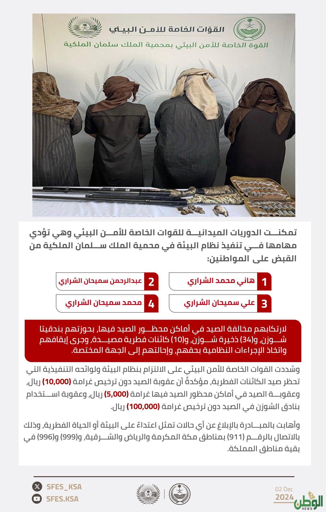 أعلنت الدوريات الميدانية للقوات الخاصة للأمن البيئي القبض على المواطنين هاني محمد الشراري وعبدالرحمن سميحان الشراري وعلي سميحان الشراري ومحمد سميحان الشراري، لارتكابهم مخالفة الصيد في أماكن محظور الصيد فيها بمحمية الملك سلمان الملكية .