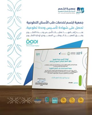 أسست جمعيّة ابتسم لخدمات طب الأسنان التطوعيّة بمنطقة مكة وحدة التطوع وفقًا للمعيار الوطني السعودي للتطوع “إدامة” وذلك في خطوة نوعيّة تسهم في تعزيز جودة الخدمات المقدمة لمستفيديها من الأسر الفقيرة والمحتاجة، من خلال رفع كفاءة العمل التطوعي وتوسيع أثره المجتمعي في المنطقة.