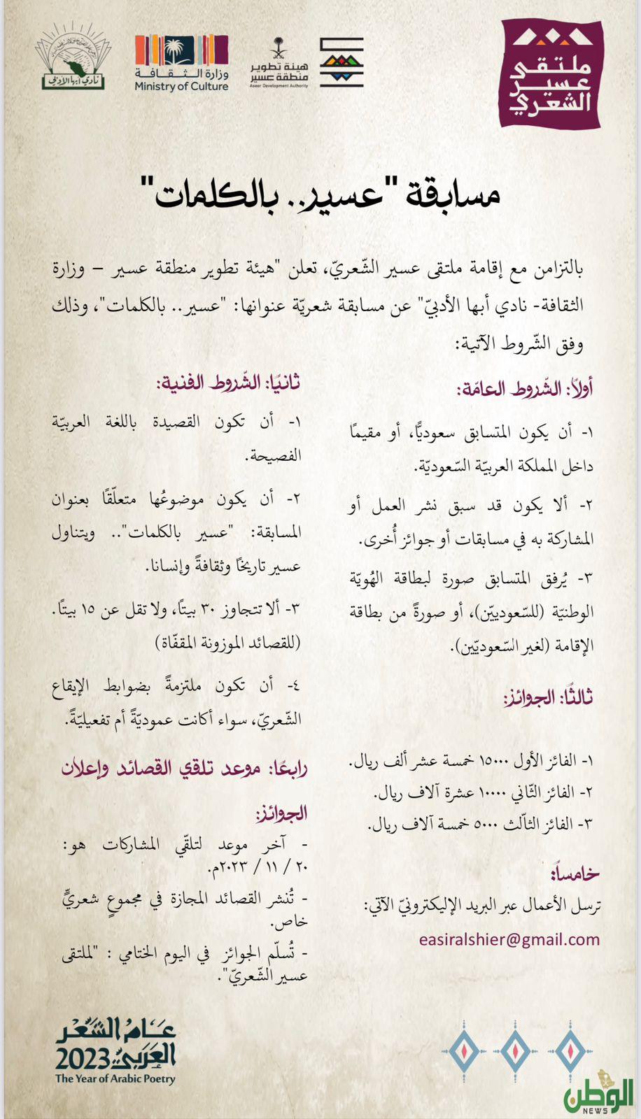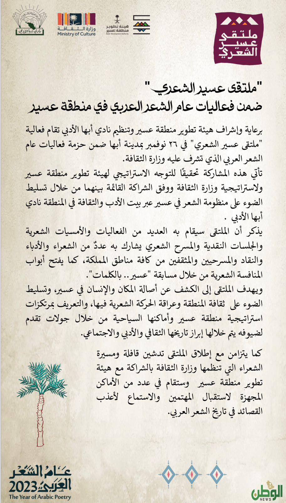 برعاية وإشراف هيئة تطوير منطقة عسير وتنظيم نادي أبها الأدبي تقام فعالية “ملتقى عسير الشعري” في 26 نوفمبر بمدينة أبها ضمن حزمة فعاليات عام الشعر العربي الذي تشرف عليه وزارة الثقافة.