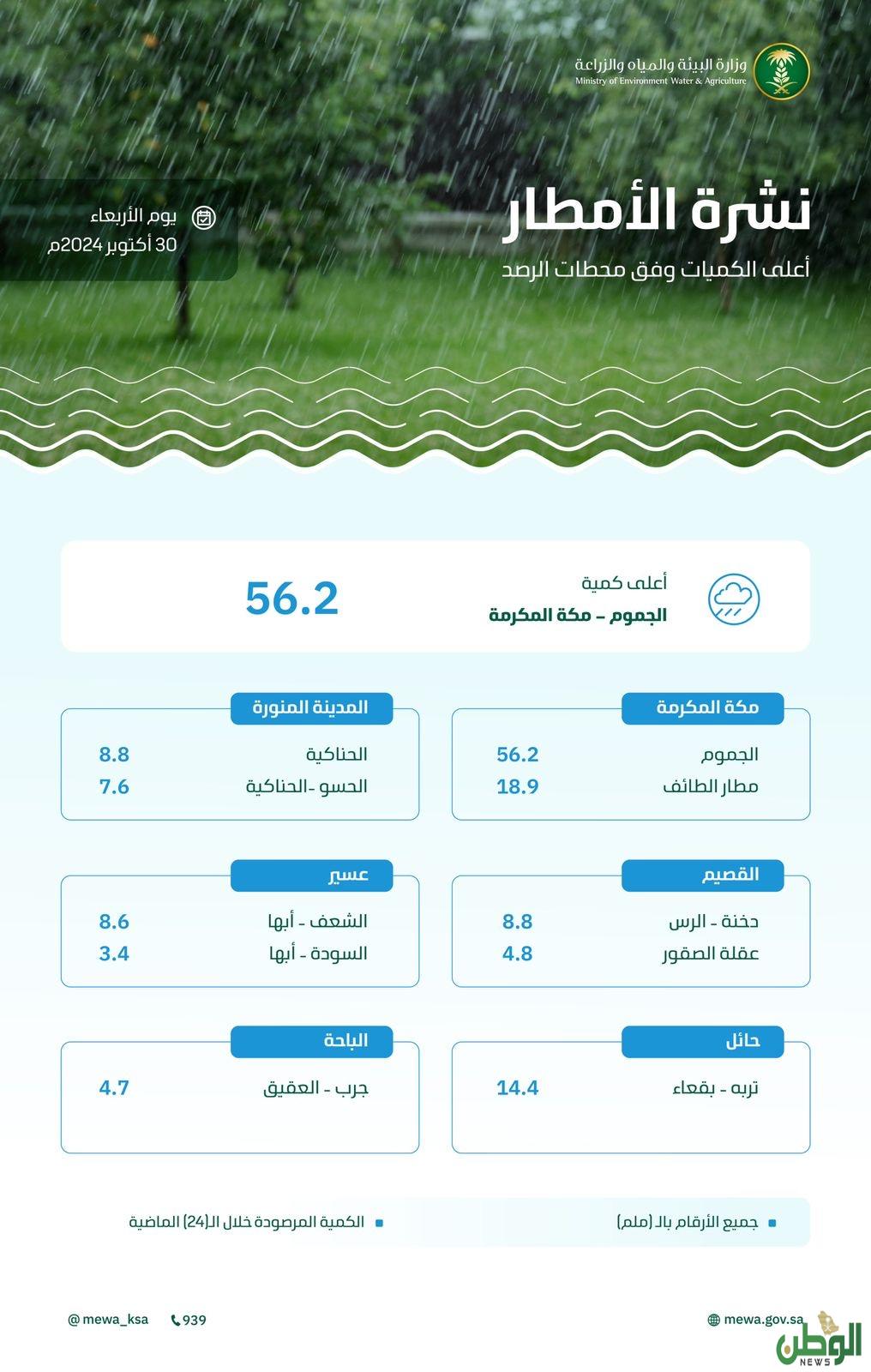 ووفقًا للتقرير اليومي لوزارة البيئة والمياه والزراعة، حول رصد كميات هطول الأمطار في مناطق المملكة كافة؛ سجّلت (31) محطة رصد هيدرولوجي ومناخي، خلال الفترة من الساعة التاسعة صباح الثلاثاء 29 أكتوبر، وحتى التاسعة صباح الأربعاء 30 أكتوبر 2024م، هطول أمطارٍ في مناطق (الرياض، مكة المكرمة، المدينة المنورة، القصيم، عسير، حائل، تبوك، الباحة، والجوف).
