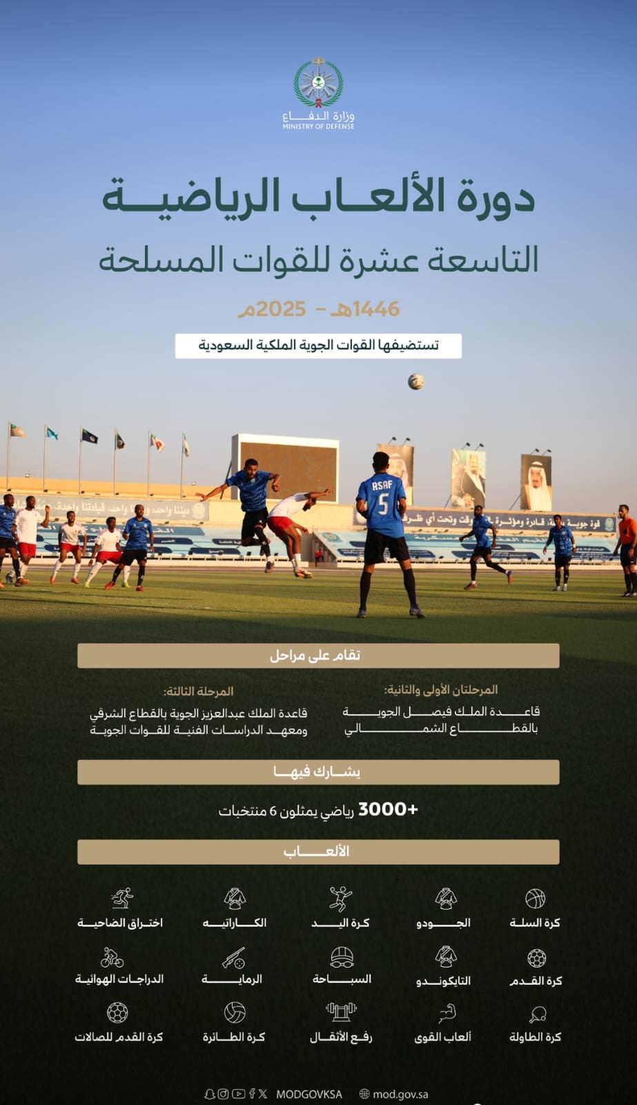 تستضيف القوات الجوية الملكية السعودية الأسبوع المُقبل، منافسات دورة الألعاب الرياضية التاسعة عشرة للقوات المسلحة، بمشاركة 6 منتخبات وأكثر من 3 آلاف رياضي يمثلون القوات البرية الملكية السعودية، والقوات الجوية الملكية السعودية، والقوات البحرية الملكية السعودية، وقوات الدفاع الجوي الملكي السعودي، وقوة الصواريخ الإستراتيجية الملكية السعودية، والإدارة العامة للخدمات الصحية.