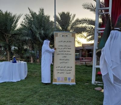 بعدها ألقيت كلمة الشيخ حمود حماد الثبيتي – ألقاها نيابة عنه المنسق الإعلامي بالمتحف الأستاذ منصور قريشي- رحب فيها بالحضور