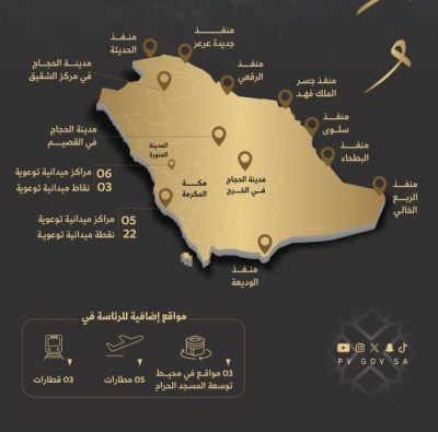 وشملت هذه المواقع (22) نقطة ميدانيّة توعويّة و(5) مراكز ميدانيّة توعويّة في منطقة مكة المكرمة والمشاعر المقدسة، و(9) مراكز ونقاط ميدانيّة بمنطقة المدينة المنورة، كما شملت منافذ الدخول البرية بالبطحاء وسلوى والربع الخالي والرقعي وجسر الملك فهد بالمنطقة الشرقيّة ، ومنفذ جديدة عرعر بالحدود الشماليّة ، ومنفد الوديعة بنجران، ومدينة الحجاج في محافظة الخرج بمنطقة الرياض،ومدينة الحجاج