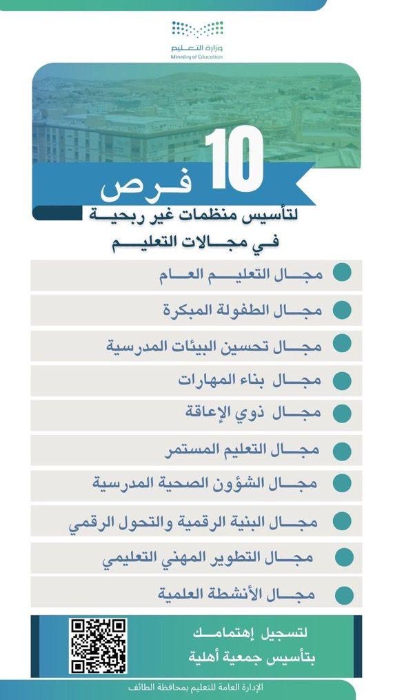 أعتمدت الإدارة العامة للتعليم بمحافظة الطائف 10 فرص لتأسيس منظمات غير ربحيّة في مجالات التعليم