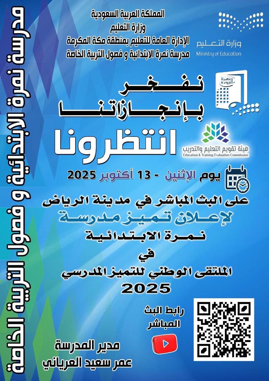 حققت مدرسة نمرة الابتدائية وفصول التربية الخاصة بمحافظة العرضيات، إنجازًا نوعيًا بفوزها بجائزة التميز على مستوى مدارس المملكة، وذلك ضمن مبادرة وزارة التعليم التي تُكرّم المدارس النموذجية التي تميّزت بتكامل الجهود بين إداراتها ومعلميها وطلابها وأولياء الأمور.