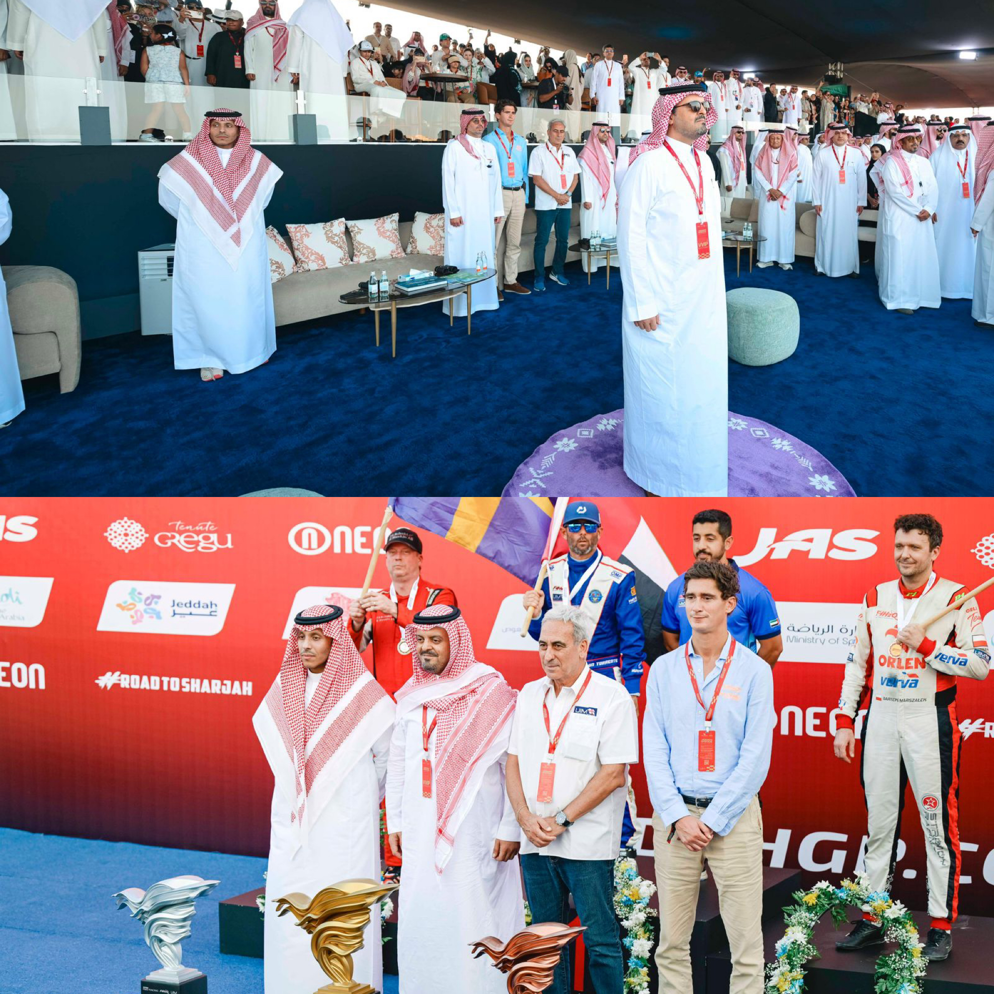 وعقب إسدال الستار على مجريات السباق وانتهاء المنافسات انطلقت مراسم تتويج الفائزين، حيث عزف السلام الملكي وكرّم صاحب السمو الملكي الأمير سعود بن مشعل بن عبدالعزيز، الفائزين وسط أجواء احتفالية مُبهرة، وموسيقى حماسية منحت الحدث طابعًا عالميًا، فيما أضاءت عروض الألعاب النارية سماء جدة احتفالًا بنجاح هذه البطولة.