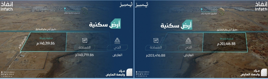 تعلن يُسر العقارية وبإشراف مركز الإسناد والتصفية #إنفاذ عن فرصتين عقارية بمزاد واجهة العارض